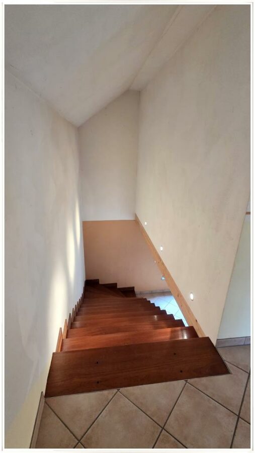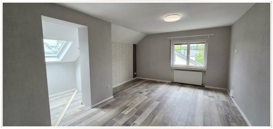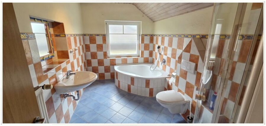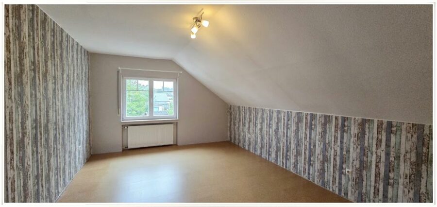 Eine massive Treppe führt Sie in das Dachgeschoss des Hauses, welches für Sie 3 Schlafzimmer, ein Badezimmer (inkl. Eckbadewanne, WC, Waschbecken und Dusche) sowie einen Spind bereithält.